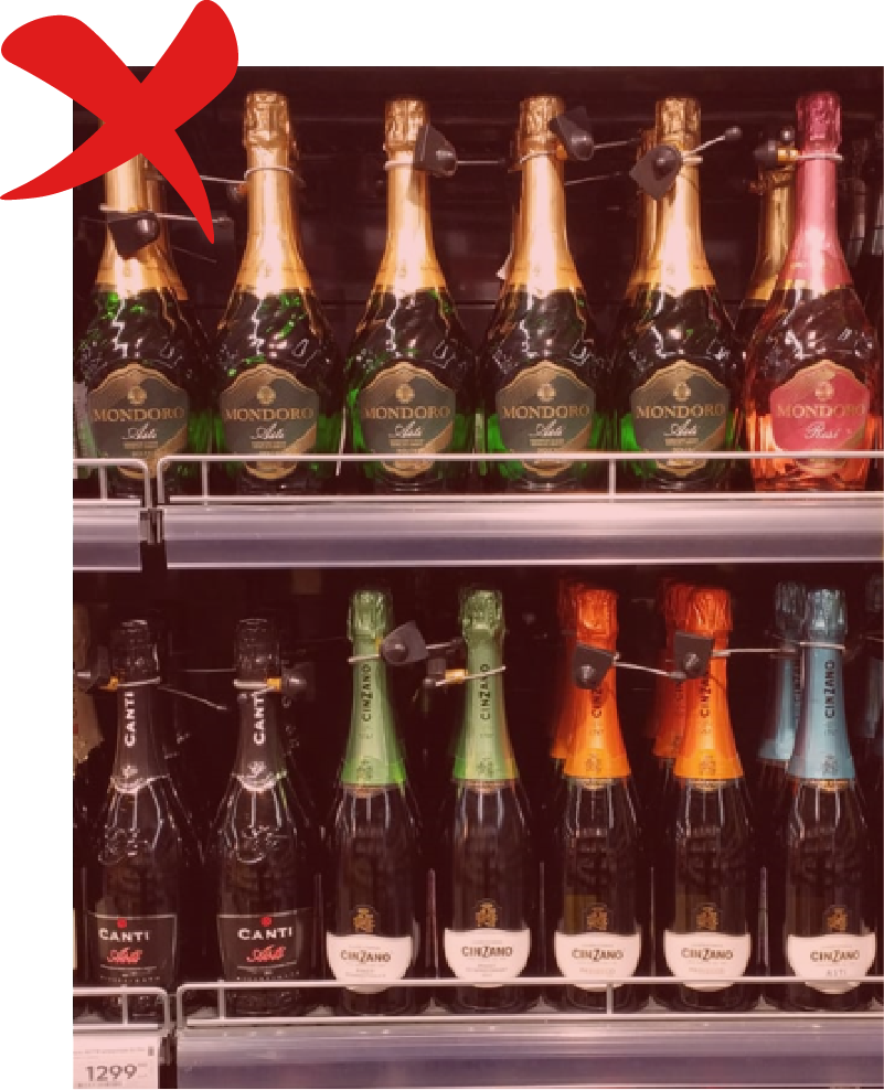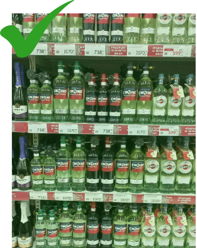 Все SKU повернуты лицом к покупателю и стоять во всю глубину полки. Внимательно следи за чистотой продукции, на ней не должно быть пыли